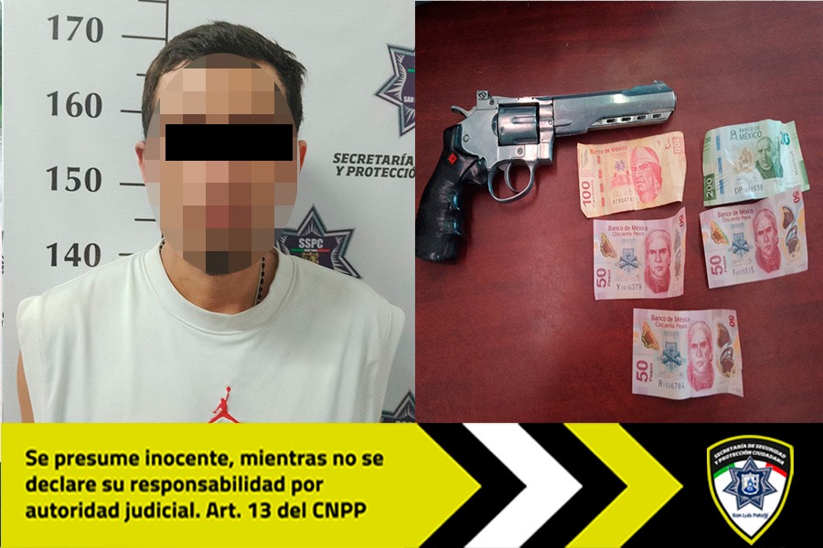 Con las características del implicado, los agentes municipales lograron ubicarlo y detenerlo en las inmediaciones. En la revisión preventiva de seguridad se le encontró una réplica de arma de fuego de aire elaborada con metal y la cacha envuelta en cinta negra, así como dinero en efectivo que coincidía con la cantidad sustraída del comercio.