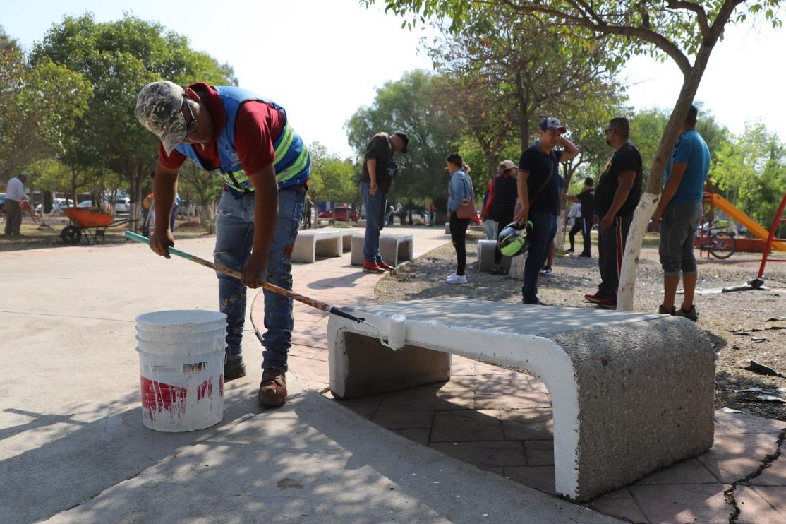 Personal de Presidencia, DIF, Educación, Instancia de las Mujeres, Tesorería, Gestión Ecológica, Interapas, entre otras dependencias municipales, junto con vecinas y vecinos de Los Álamos II, rehabilitaron jardineras, el área de juegos infantiles, las canchas y otros espacios de uso comunitario en la colonia.