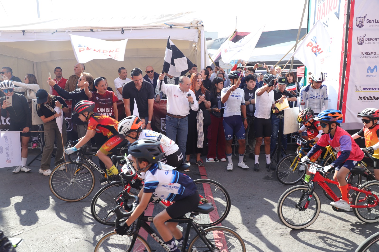 San Luis Potosí.– Emotiva y muy vibrante resultó la competencia denominada “Nairo Kids”, desarrollada la mañana de este sábado en el primer cuadro de la ciudad, donde el Presidente Municipal Enrique Galindo Ceballos, así como los ciclistas Nairo Quintana y la joya mexicana Isaac del Toro dieron el banderazo de salida a las seis categorías contempladas.