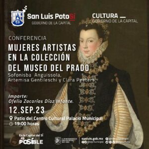 El Gobierno de la Capital invita al público en general, estudiantes de arte y de historia, académicos, a que asistan y disfruten de la conferencia “Mujeres artistas en la colección del Museo del Prado: Sofonisba Anguisola, Artemisa Gentilechi y Clara Peeters”, que será impartida por Ofelia Zacarías Díaz Infante, maestra en historia del arte mexicano por la Universidad Autónoma de San Luis Potosí.