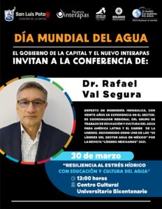 SLP.- Como parte del Plan Emergente SÍ al Agua emprendido por el Gobierno de la Capital de San Luis Potosí y el Nuevo Interapas, se realizará una nueva conferencia de parte del experto internacional Rafael Val Segura, con el tema “Resiliencia al Estrés Hídrico con Educación y Cultura del Agua”.