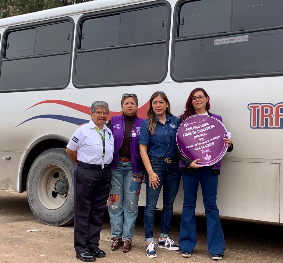 Con el objetivo de fortalecer acciones para coadyuvar a la eliminación de la violencia hacia las mujeres, el Gobierno Municipal a través de la Instancia de las Mujeres instaló alrededor de 75 Puntos Violeta, (stickers que contienen los números de emergencia y rutas de atención en caso de violencia hacia las mujeres), en unidades de transporte de personal de la empresa Transportes Empresariales de San Luis S.A de C.V., (Traeme).