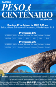 El H. Ayuntamiento de Villa de Reyes a través del Departamento de Cultura y Turismo, Club de Atletismo, con el Aval de la Asociación Potosina de Atletismo, llevarán a cabo la Primera Edición de la Carrera Peso Centenario, el próximo domingo 27 de febrero.