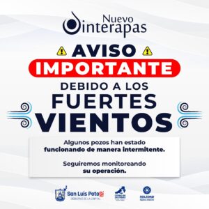 SLP.- El Nuevo Interapas monitorea los pozos de su jurisdicción en la zona metropolitana, debido a los fuertes vientos que han prevalecido durante los últimos días.
