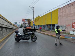 En este punto y para disminuir el tránsito vehicular en avenida Universidad en dirección a la Alameda, oficiales de Policía Vial canalizan la circulación en dirección a la avenida Manuel J. Othón, calle Décima en dirección al paso a desnivel de Manuel José Othón.
