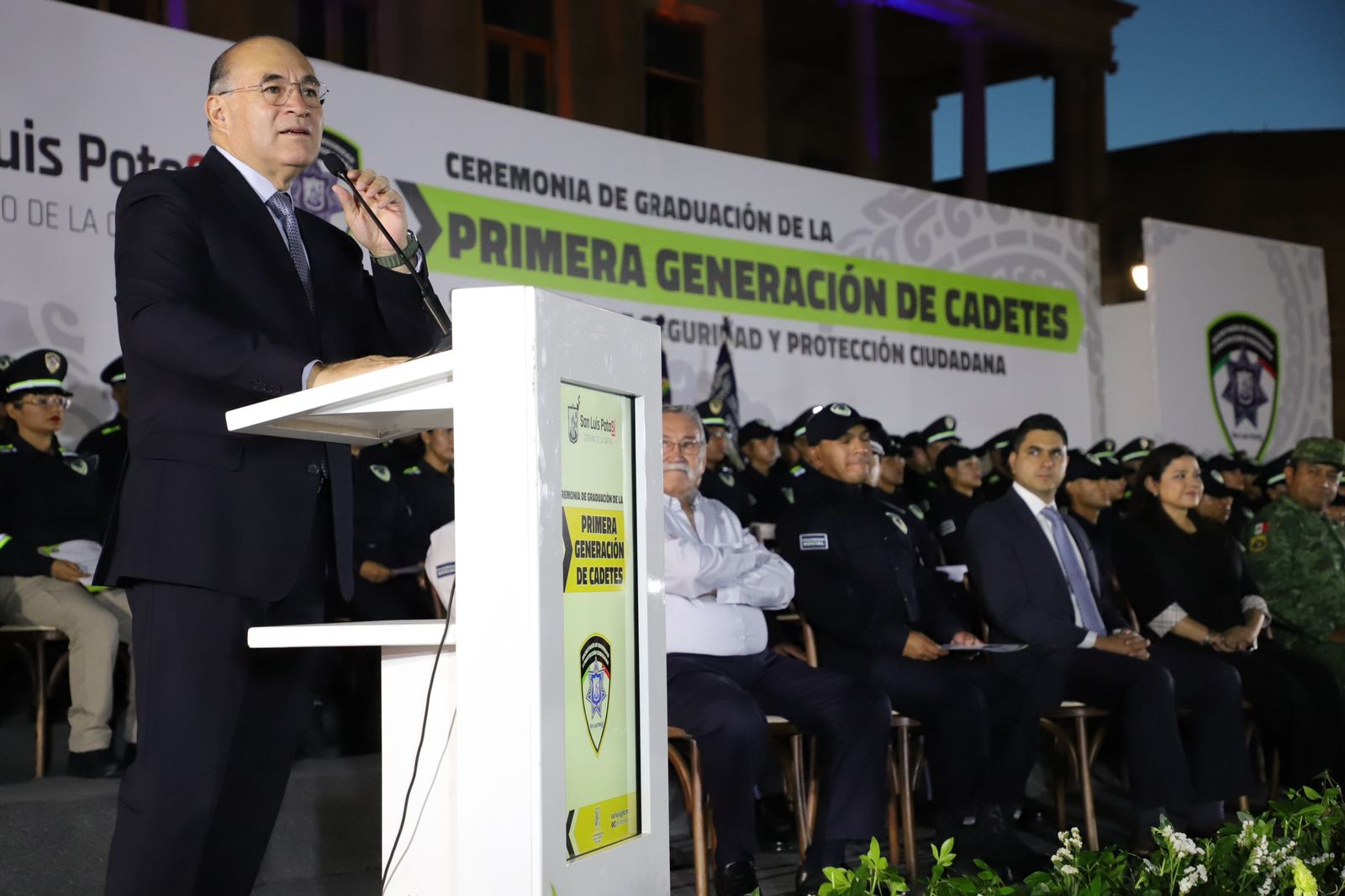 Por su parte, el Comisario Juan Antonio Villa Gutiérrez, Secretario de Seguridad y Protección Ciudadana del Ayuntamiento de San Luis Potosí, expresó que esta primera generación ha logrado cumplir con un programa íntegro, extenso y profesional, con los valores fundamentales de la SSPC, “honor, lealtad y honradez”. Con estos nuevos oficiales se alcanza una tasa de policías superior al 65 por ciento del país, explicó Villa Gutiérrez.