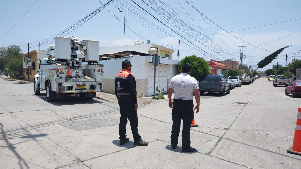 Durante las maniobras para bajar un árbol que colapsó y se mantuvo inclinado sobre cables de media y alta tensión, en la calle Del Pozo, en la colonia Tercera Grande, entre calle Arbolitos y las vías México Laredo, al norte de la capital potosina; el Director de Protección Civil Municipal indicó que la atención al reporte fue inmediata, pero no se pudo proceder a bajarlo, ante el riesgo que suponen los cables que sostenían al pino de más de 8 metros de altura, por lo que fue necesario solicitar el apoyo de la Comisión Federal de Electricidad y sus cuadrillas de atención, quienes también trabajaron todo el fin de semana, resolviendo casos similares y de caída de cables, principalmente.