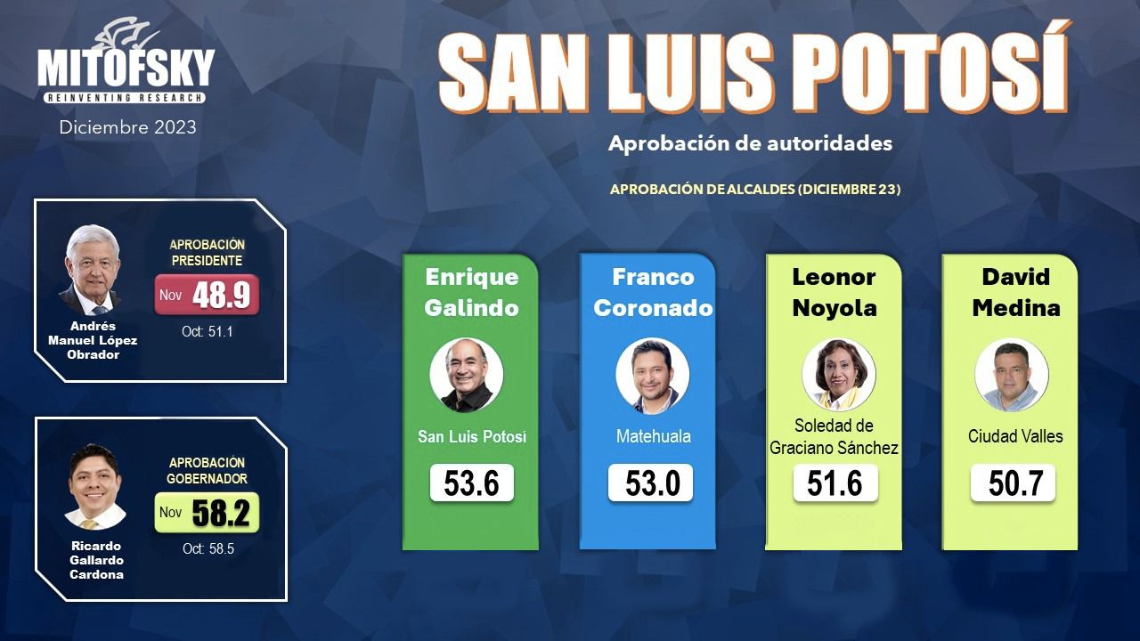 Además, la aprobación de 53.6 por ciento de la ciudadanía de San Luis Potosí representa la viabilidad de la reelección para el Alcalde Enrique Galindo, pues las y los potosinos tienen expectativa por la continuidad de las acciones de rescate de la ciudad de San Luis Potosí que ha emprendido el actual Presidente Municipal.