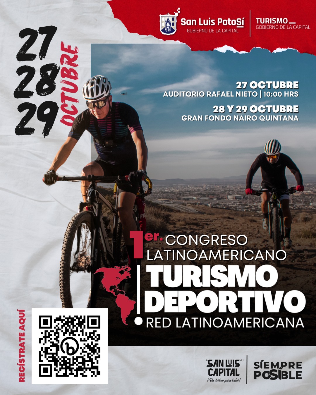 De manera simultánea al magno evento ciclista Gran Fondo Nairo Quintana, San Luis Potosí será sede del Primer Congreso Latinoamericano de Turismo Deportivo, del 27 al 29 de octubre, en el que destacadas personalidades en diferentes ámbitos del deporte y expertos en eventos del más alto nivel, participarán en paneles, conferencias y talleres que nuevamente darán proyección internacional a la Capital potosina.