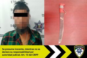 Gracias a los patrullajes de seguridad y vigilancia sobre el cuadrante sur, agentes de Guardia Municipal de la Secretaría de Seguridad y Protección Ciudadana (SSPC) efectuaron la detención de una persona de sexo masculino que fue detectado caminando en calles de la colonia El Aguaje, portando en la mano un machete de 48 centímetros de hoja.