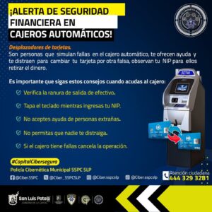En las redes sociales de la Secretaría de Seguridad y Protección Ciudadana así como de la Policía Cibernética Municipal se estarán emitiendo mensajes para prevenir esta modalidad delictiva y a la par, a través de las áreas operativas de Guardia Municipal, Policía Vial y Tecnologías en Inteligencia Social se estará reforzando la presencia preventiva en cajeros automáticos de la Capital potosina.