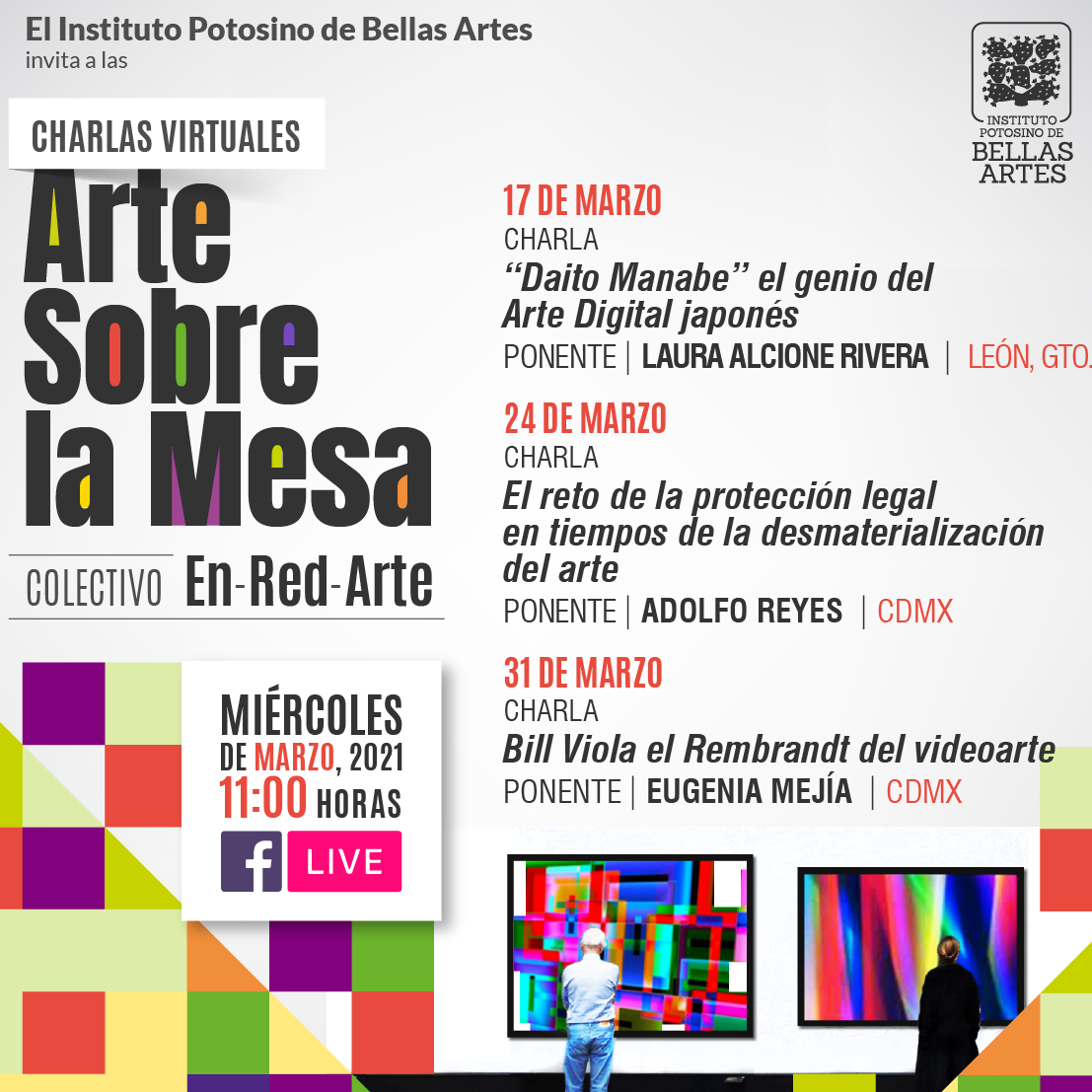 La Secretaría de Cultura de San Luis Potosí (SECULT) invita a participar en el programa de charlas virtuales “Arte Sobre la Mesa” que el Instituto Potosino de Bellas Artes (IPBA) llevará a cabo los días 17, 24 y 31 de marzo a las 11:00 horas por medio de Facebook Live.