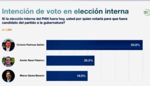 En el sondeo el 55 por ciento de la preferencia de la militancia panista, se pronunció a favor de Octavio Pedroza, duplicando la ventaja a Xavier Nava Palacios quien obtuvo el 25 por ciento de apoyo de los encuestados.
