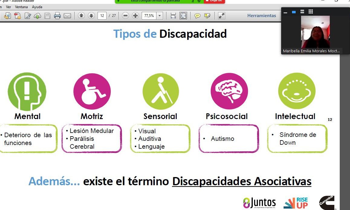Para iniciar el taller se dio la bienvenida al personal que se unió al taller virtual, enseguida fueron definidos los conceptos de sexo, género y discapacidad. Otro de los temas que se abordaron fue el de las barreras en la discapacidad como son: la física, de actitud e información; y los tipos: mental, motriz, sensorial, psicosocial e intelectual.