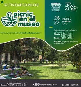 A partir de junio, el último fin de semana de cada mes, el Museo Francisco Cossío llevará a cabo la actividad familiar “Picnic en el Museo”, que iniciará el 26 y 27 de junio, informó Arturo Herrera Silva, titular de la Secretaría de Cultura de San Luis Potosí.