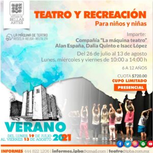 Como parte del programa de Cursos de Verano que ofrece el Instituto Potosino de Bellas Artes (IPBA) en su edición 2021, la Secretaría de Cultura de San Luis Potosí (SECULT), invita a conocer y ser parte de las actividades de teatro enfocadas para público de todas las edades y que se impartirán del 19 de julio al 13 de agosto.