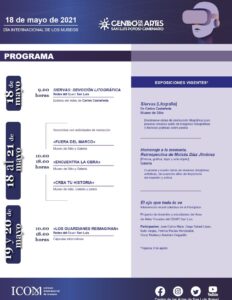 En nuestra entidad, del 18 al 21 de mayo, el Centro de las Artes efectuará actividades virtuales, a través de Facebook live institucional, y presenciales en las que se incluyen charlas, recorridos diurnos y nocturnos por el recinto, galerías, espacios y salas de exhibición, así como actividades de mediación, presentación de videos y cápsulas informativas.