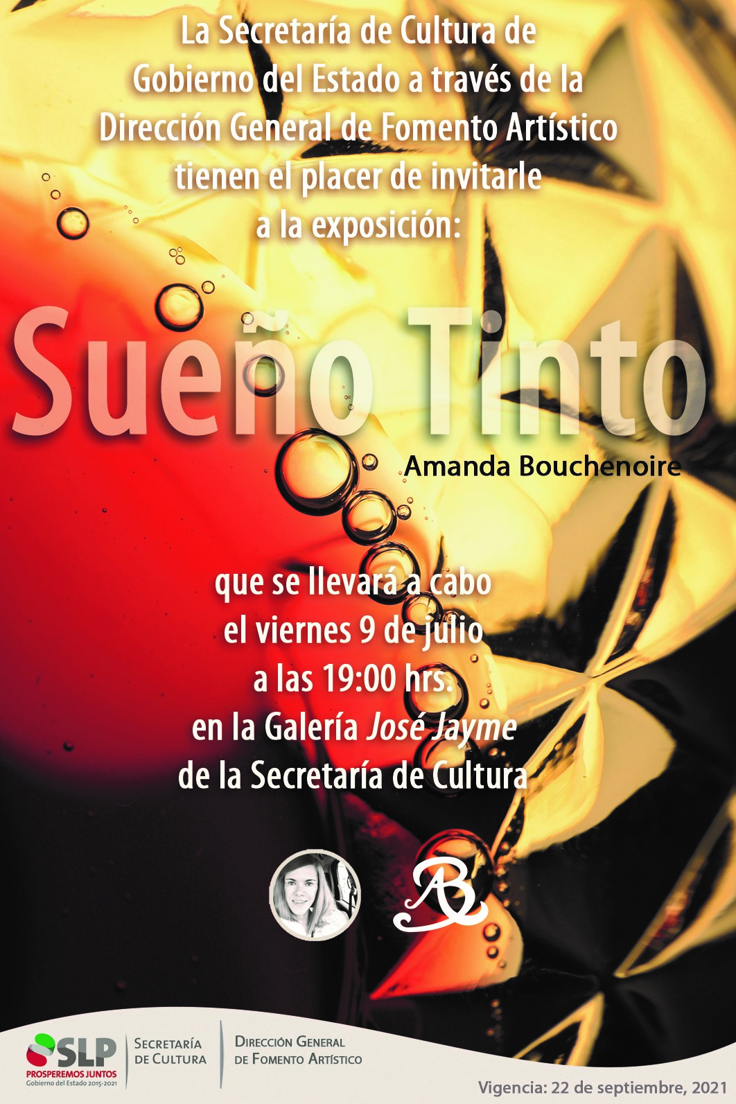 La Secretaría de Cultura de San Luis Potosí (SECULT) invita a la inauguración de la exposición fotográfica “Sueño tinto” de Amanda Bouchenoire, que se llevará a cabo el viernes 09 de julio a las 19:00 horas, en la Galería José Jayme y que permanecerá vigente hasta el 22 de septiembre de 2021.