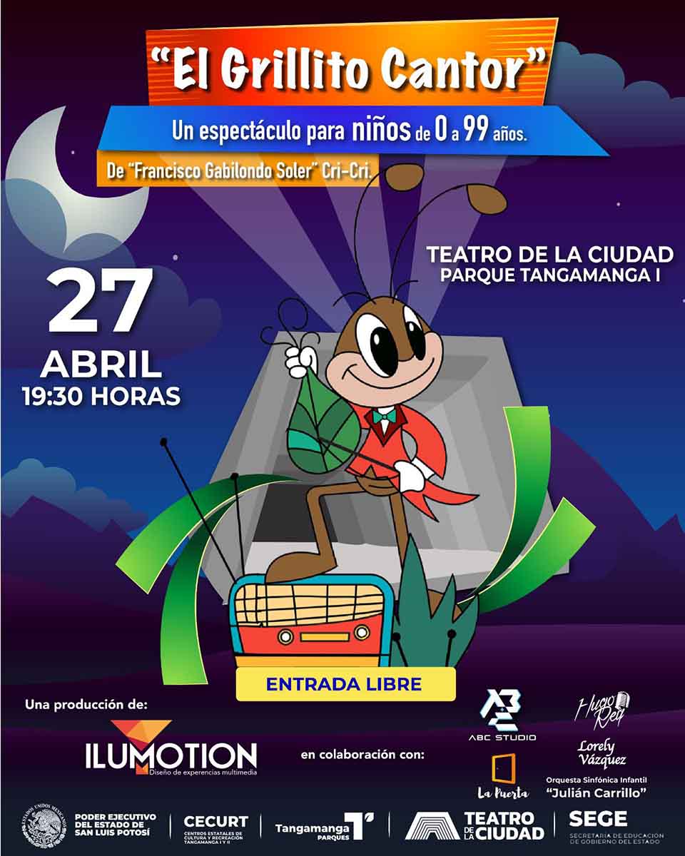 El Centro Estatal de Cultura y Recreación Tangamanga (Cecurt), bajo el auspicio del Poder Ejecutivo del Estado, se complace en invitar a todas las familias a celebrar el Día de la Niña y el Niño con el espectáculo gratuito «El Grillito Cantor». El evento tendrá lugar el sábado 27 de abril a las 19:30 horas en el Teatro de la Ciudad del Parque Tangamanga I.