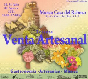 La Secretaría de Cultura de San Luis Potosí (SECULT) invita al público a la Tercera Venta Artesanal en el Pueblo Mágico de Santa María del Río que se realizará el 30, 31 de julio y 01 de agosto, en las instalaciones del museo Casa del Rebozo, en un horario de 11:00 a 17:00 horas.