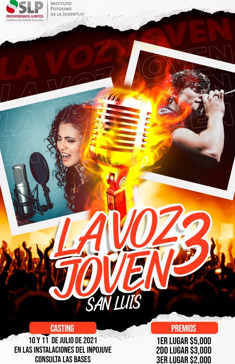 Se encuentra abierta la convocatoria para la tercera edición del concurso “La voz joven SLP”, en la que podrá participar población de entre 12 a 35 años de edad, y que tiene fecha límite de inscripción el 9 de julio, informó el titular del Instituto Potosino de la Juventud (INPOJUVE).