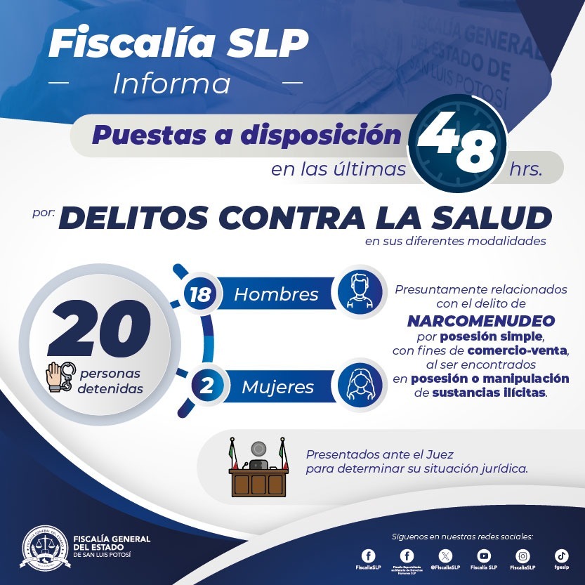 Del 14 al 16 de junio de 2024, la Fiscalía General del Estado de San Luis Potosí (FGESLP) detuvo a 20 personas por su probable participación en delitos contra la salud en sus diferentes modalidades. Las personas detenidas fueron puestas a disposición de jueces para determinar su situación jurídica.