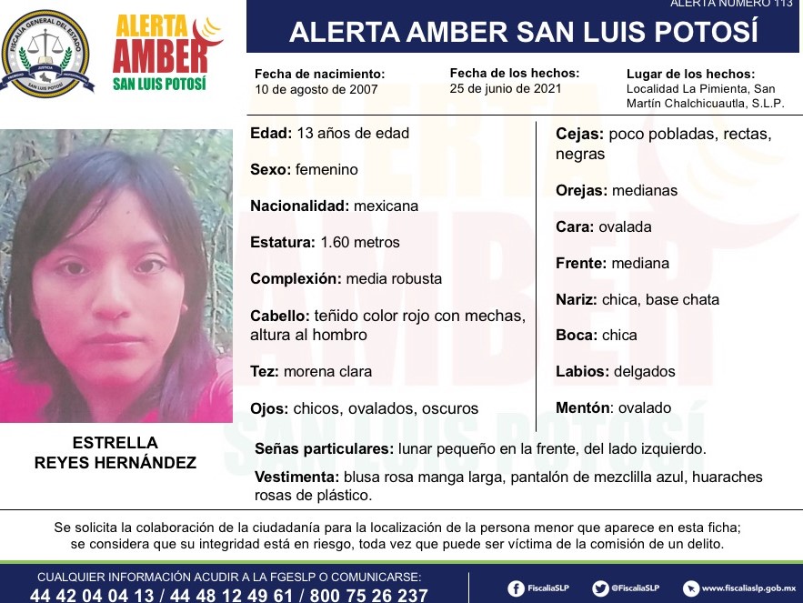 SLP. – La Fiscalía General del Estado de San Luis Potosí (FGESLP), activó una Alerta Amber, para la localización de una menor de 13 años de edad, de nombre Estrella Reyes Hernández quien fue vista por última vez en la comunidad La Pimienta, perteneciente al municipio de San Martín Chalchicuautla.