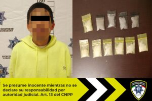 Gracias a los patrullajes de seguridad y vigilancia de agentes de Guardia Municipal de la Secretaría de Seguridad y Protección Ciudadana (SSPC) se llevó a cabo el arresto de una persona de sexo masculino que fue sorprendido en portación de once bolsas que contenían sustancia blanca granulada con las características similares a la droga conocida como cristal, los hechos se suscitaron en la colonia Mezquital.