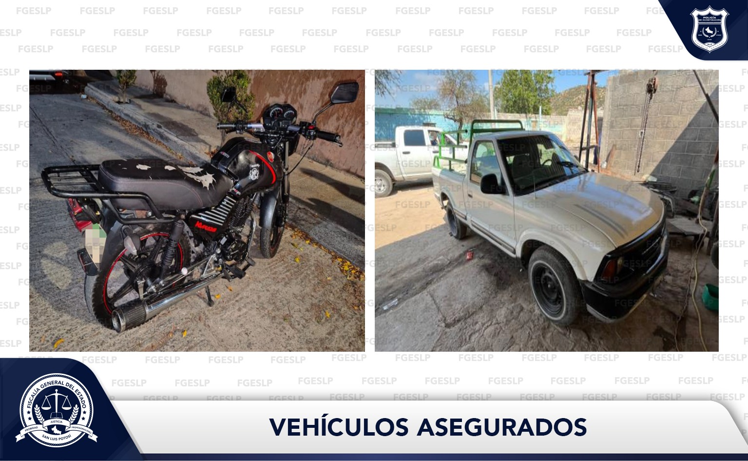 Agentes investigadores de la Unidad de Robo de Vehículos aseguraron una moto y un automóvil en territorio potosino, así lo informó la Fiscalía General del Estado de San Luis Potosí (FGESLP).