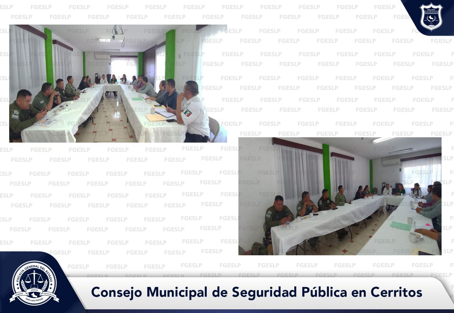 Reiterando el compromiso de la Fiscalía General del Estado de San Luis Potosí (FGESLP) con cada uno de los municipios, personal de la Dirección General de Métodos de Investigación (DGMI) participó en la Vigésima Tercera Sesión Ordinaria del Consejo Municipal de Seguridad Pública en Cerritos.