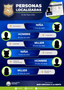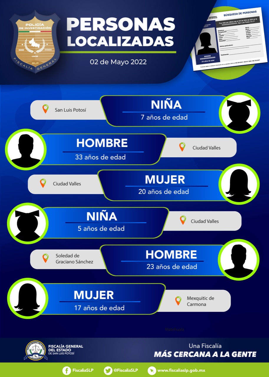 SLP. – La Fiscalía General del Estado (FGE) localizó en las últimas horas, a seis personas que contaban con una ficha de búsqueda en San Luis Potosí.