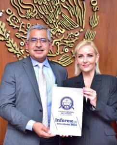 Posteriormente, en el Auditorio “Manuel Gómez Morín”, del edificio del Poder Legislativo, el Fiscal General entregó el Informe a la mesa directiva a través de su presidenta, la diputada María Aránzazu Puente Bustindui.