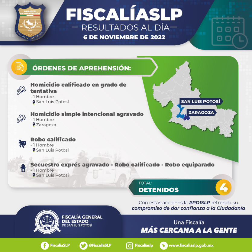 Personal de la Fiscalía General del Estado (FGE) llevó a cabo la detención de cuatro hombres a los que se les imputan diversos delitos cometidos en San Luis Potosí.