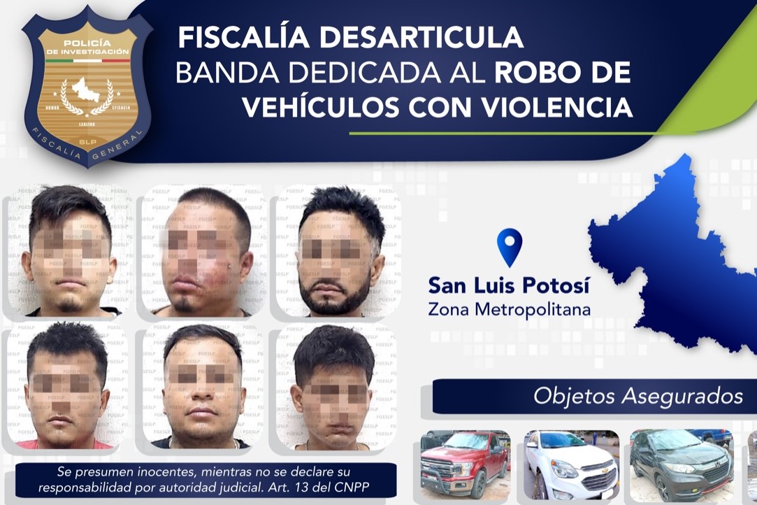 SLP. – Fueron capturado seis probables integrantes de una banda dedicada al robo con violencia de vehículos en San Luis Potosí, informó la Fiscalía General del Estado (FGE).