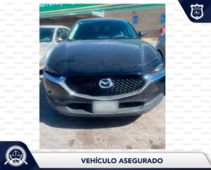 El hecho se registró en la avenida Acceso Norte de la ciudad de San Luis Potosí, donde se encontró un automotor color negro, marca Mazda, tipo CX30, modelo 2021, al cual le fueron detectadas irregularidades en la serie y se pudo establecer que esta fue alterada.
