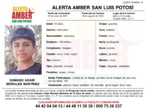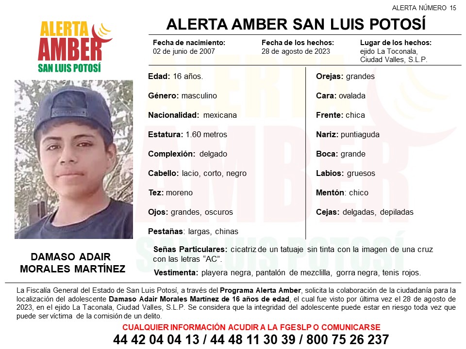 En Ciudad Valles, es buscado mediante Alerta Amber el adolescente Dámaso Adair Morales Martínez, mismo que fue visto por última vez en el ejido La Taconala.