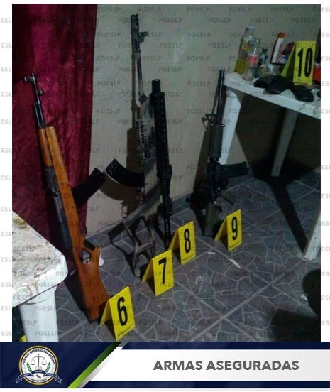 VILLA JUAREZ. – Derivado de la obtención de una orden de cateo, la Fiscalía General del Estado de San Luis Potosí (FGESLP) en coordinación con autoridades estatales y federales, lograron el aseguramiento de armas de fuego largas, cargadores, cartuchos útiles, droga y equipo táctico en un inmueble de Villa Juárez.