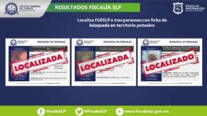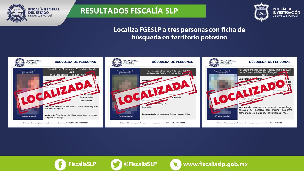 Jimena de 13 años de edad, Kendra de 17 y Tereso de 57, tres personas para las cuales se presentó una denuncia de no localización, fueron ubicadas por la Dirección General de Métodos de Información (DGMI), informó la Fiscalía General del Estado de San Luis Potosí (FGESLP).