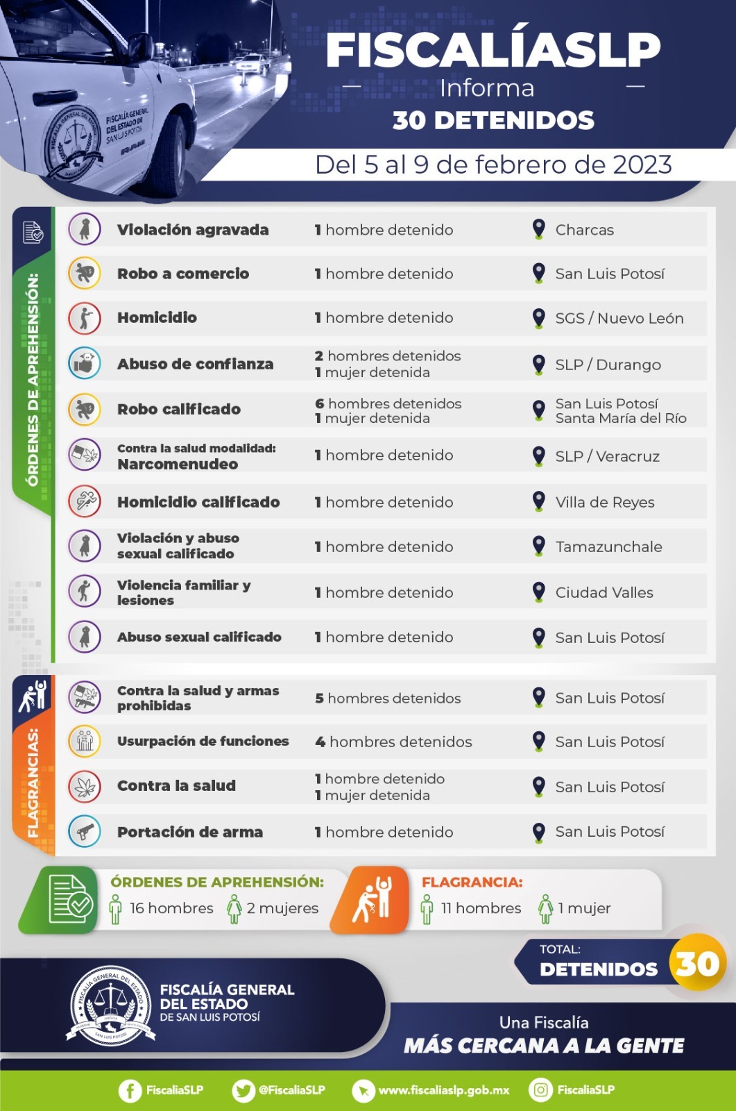 SLP. – Durante los últimos cinco días, la Fiscalía General del Estado (FGE) ha detenido a 18 personas mediante una orden de aprehensión, y a 12 más en flagrancia, al estar posiblemente relacionadas en la comisión de algún delito en San Luis Potosí.