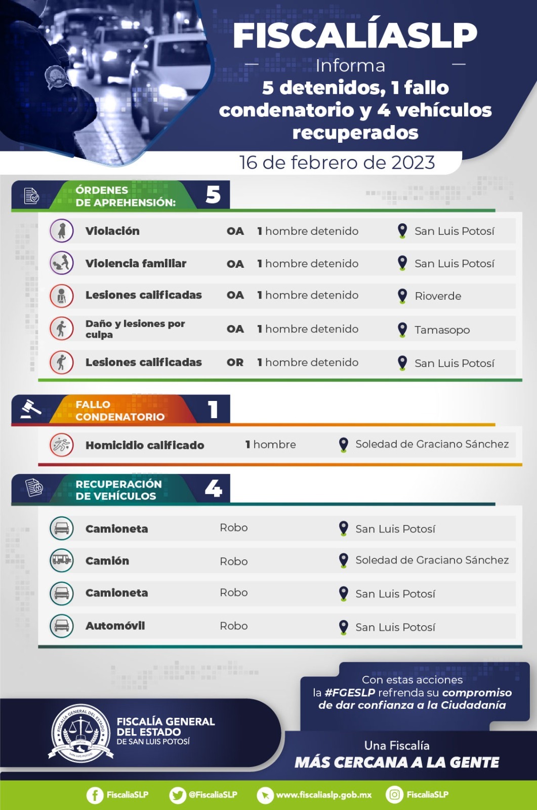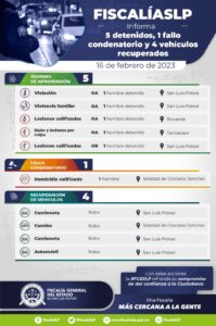 La Fiscalía General del Estado de San Luis Potosí (FGESLP) informó que, dentro de sus recientes acciones, logró un fallo condenatorio por homicidio calificado y detuvo a cinco personas mediante órdenes de aprehensión, por diversos delitos.