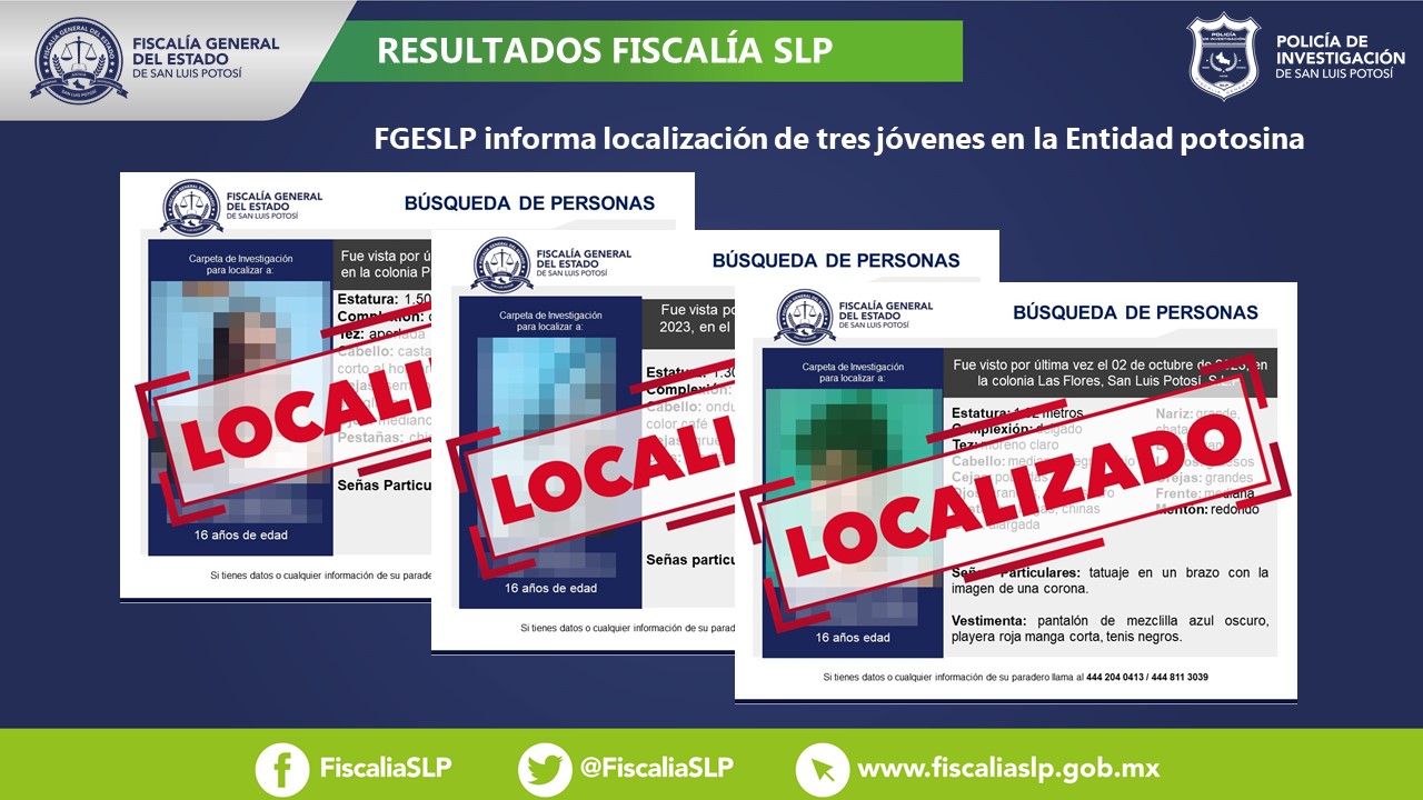 La Fiscalía General del Estado (FGE), derivado de labores implementadas por la Policía de Investigación (PDI) logró ubicar a tres personas en San Luis Potosí.