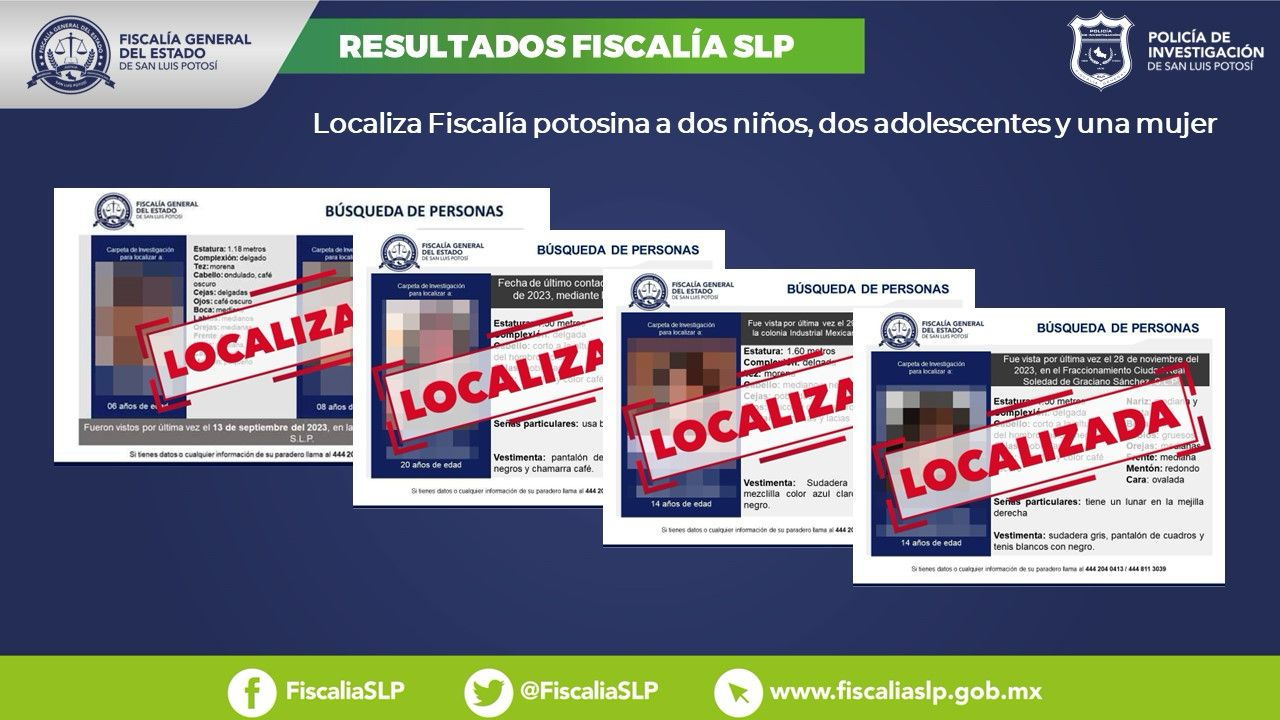 La Fiscalía General del Estado de San Luis Potosí (FGESLP) informó que derivado de las acciones implementadas por la Policía de Investigación (PDI), se dio con el paradero de cinco personas en la Entidad potosina.