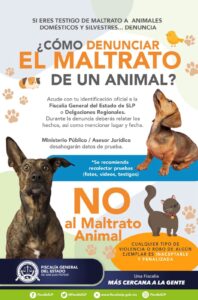 La FGESLP exhorta a la ciudadanía a que se denuncie todo tipo de maltrato o robo que perciba en animales domésticos o silvestres.