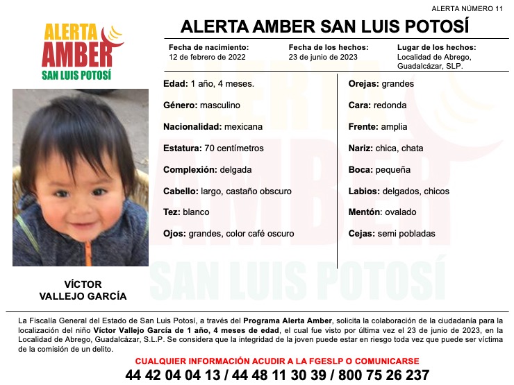 La Fiscalía General del Estado (FGESLP) activó una Alerta Amber con el fin de encontrar a Víctor Vallejo García, de 1 año y 4 meses de edad.