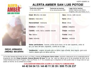 SLP. – Con la finalidad de localizar a un niño 8 años de edad, de nombre Diego Armando Jiménez Becerra, la Fiscalía General del Estado (FGE) activó una Alerta Amber.