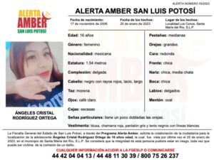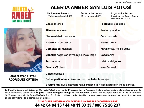 La Fiscalía General del Estado de San Luis Potosí (FGESLP) activó una Alerta Amber para la localización de Ángeles Cristal Rodríguez Ortega de 16 años de edad, en el municipio de Santa María del Río.