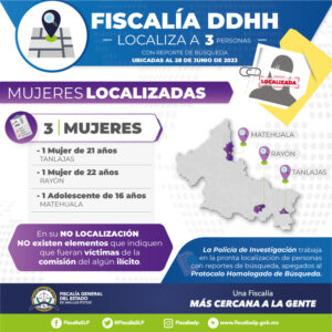 Dos mujeres adultas y una adolescente fueron ubicadas por la Policía de Investigación de la Fiscalía General del Estado de San Luis Potosí (FGESLP) ayer 28 de junio.