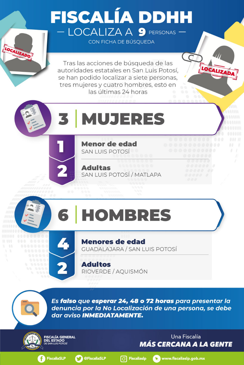 SLP. – Tras las acciones de búsqueda de las autoridades estatales en San Luis Potosí, se han podido localizar a nueve personas, tres mujeres y seis hombres, esto en las últimas 24 horas, informó la Fiscalía General del Estado (FGE).