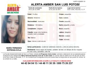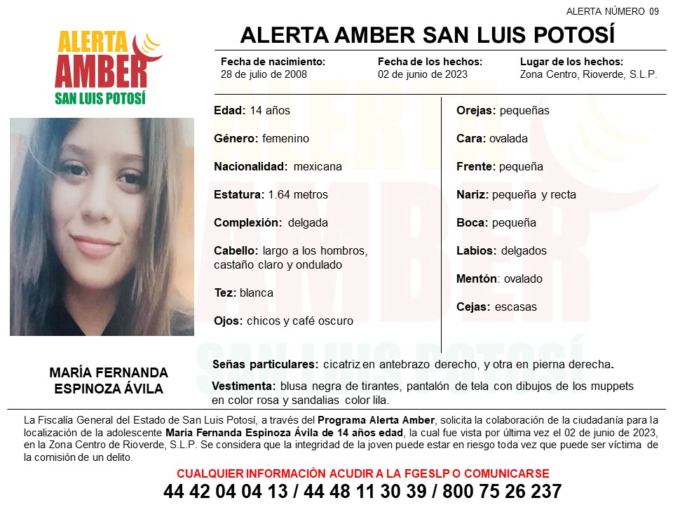 Fue activada una Alerta Amber por parte de la Fiscalía General del Estado de San Luis Potosí (FGESLP), para localizar a una adolescente de 14 años de edad en Rioverde.