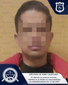 Con diversas estrategias de inteligencia, la PDI conoció la identidad del probable partícipe, quien responde al nombre de Sergio Alejandro “N”, el cual podría estar ligado en al menos 11 casos similares bajo el mismo modus operandi. Este caso fue trabajado por personal de la Fiscalía General del Estado de San Luis Potosí (FGESLP), el cual judicializó la carpeta de investigación y después se solicitó la orden de aprehensión bajo el delito de robo calificado. El mandato judicial fue cumplimentado por los policías de la FGESLP al detener al señalado y recluirlo en el penal de la Capital potosina, donde será puesto a disposición de un Juez de control que determinará su situación legal.
